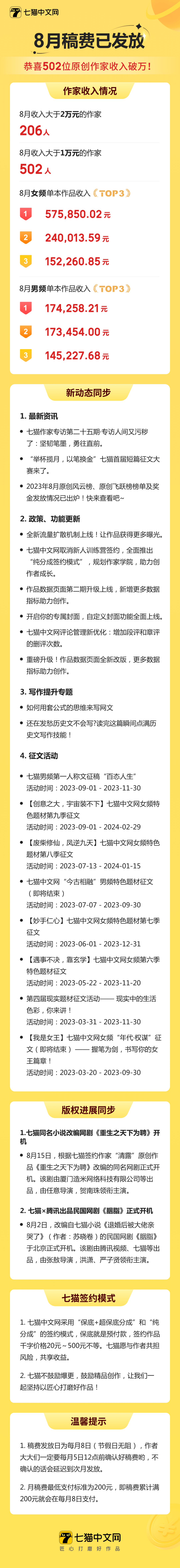 七猫中文网8月稿费已发放,502位原创作家收入破万!